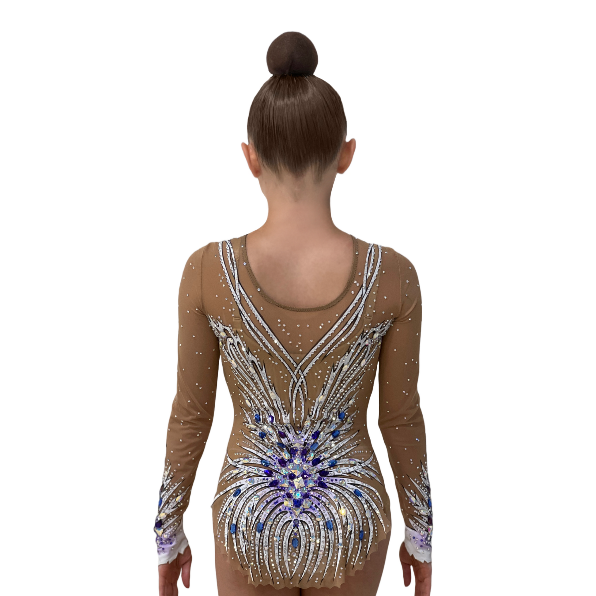 Snow Queen Rhythmic Gymnastics Leotard, available for rental or purchase, is designed to fit heights between 165-175 cm (5'4"-5'7"). Please check detailed measurements in the table below and photo gallery: